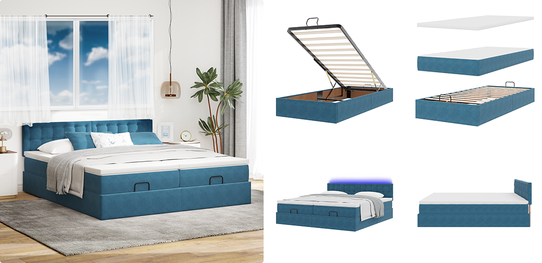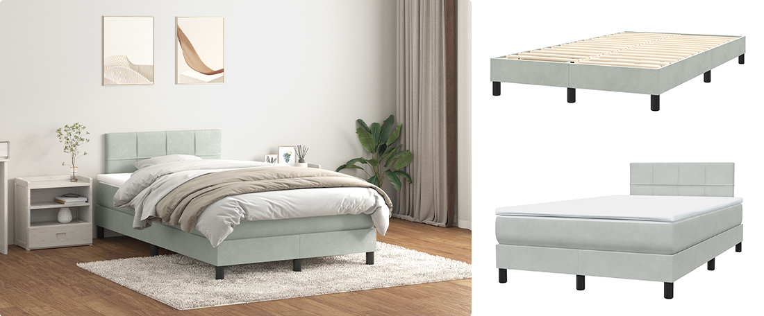 Voodikomplekti kuulub voodiraam, vedrutaskutega madrats ja pehme kattemadrats täieliku mugavuse jaoks. Sametraam lisab hubasust, vedrutaskud aga isikupärastatud tuge ja liikumise ülekannet. Liistudega põhi pakub hingavust, hoides madratsi värskena. See on täiuslik kõik ühes komplekt rahuliku ööune jaoks.