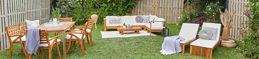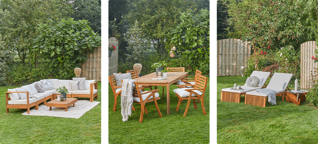 Valitud puidu kiud lisavad hubasele aiale naturaalset võlu. Kaitse seda kindlasti ilma eest, hoiustades seda siseruumides ja kattes selle kinni. Et mööbel säilitaks oma uue välimuse, soovitame seda regulaarselt õlitada või vahatada.