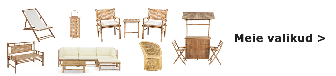 Kui tahad, et su õueala näeks välja nagu lõõgastav paradiis, on bambusest aiamööbel täiuslik valik. Meilt leiad mööblilahendusi igasse ruumi hubasest rõdust suure aiani. Loo stiilne ruum kahe bambusest režissööritooliga, mis on trendikad ja ainulaadsed. Või soeta hoopis bambusest laua ja toolide komplekt, et õues toitu nautida.